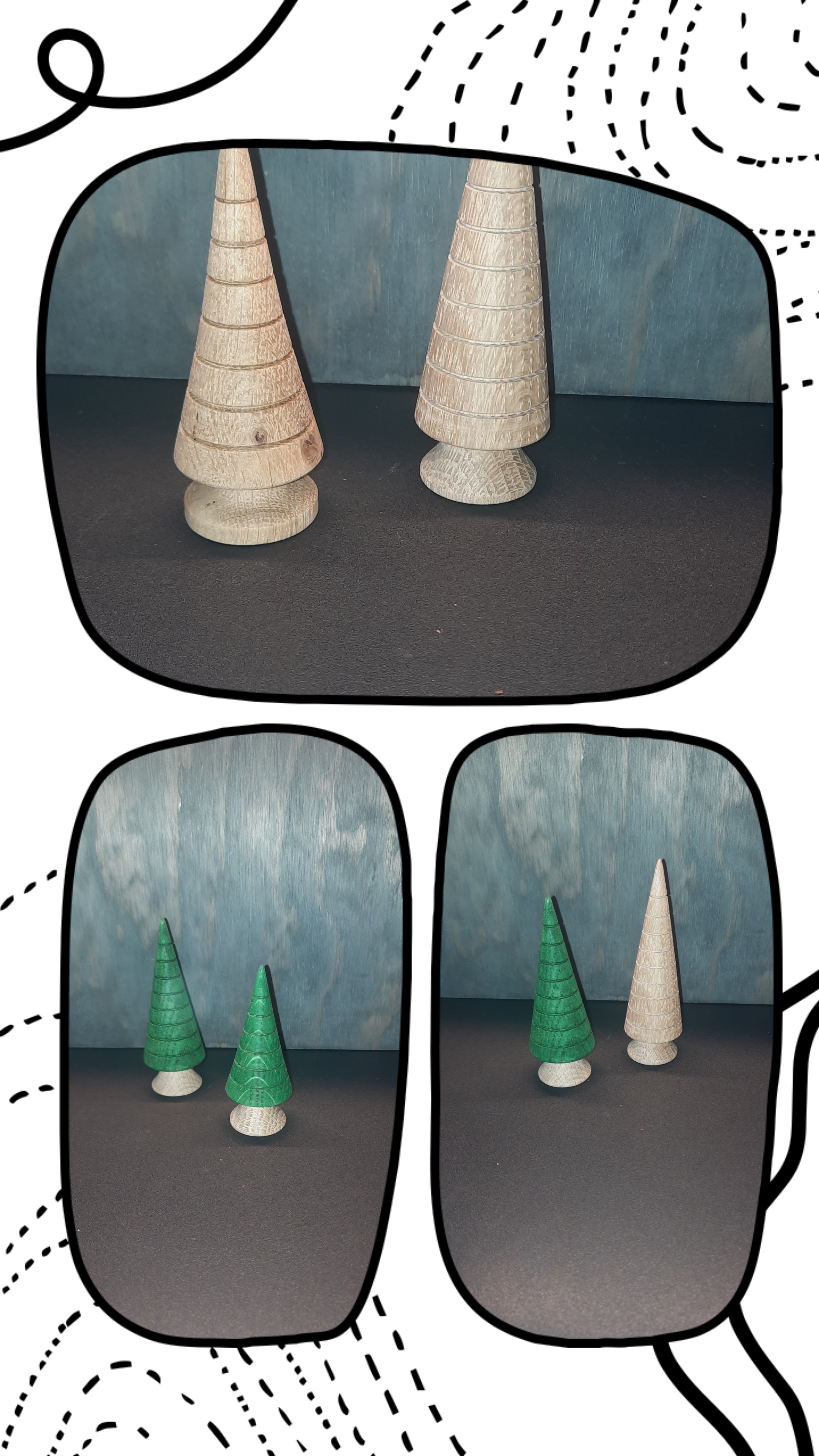 juletræer, drejet i forhåndværende træ, og nogle farvet 3 stk kr 125