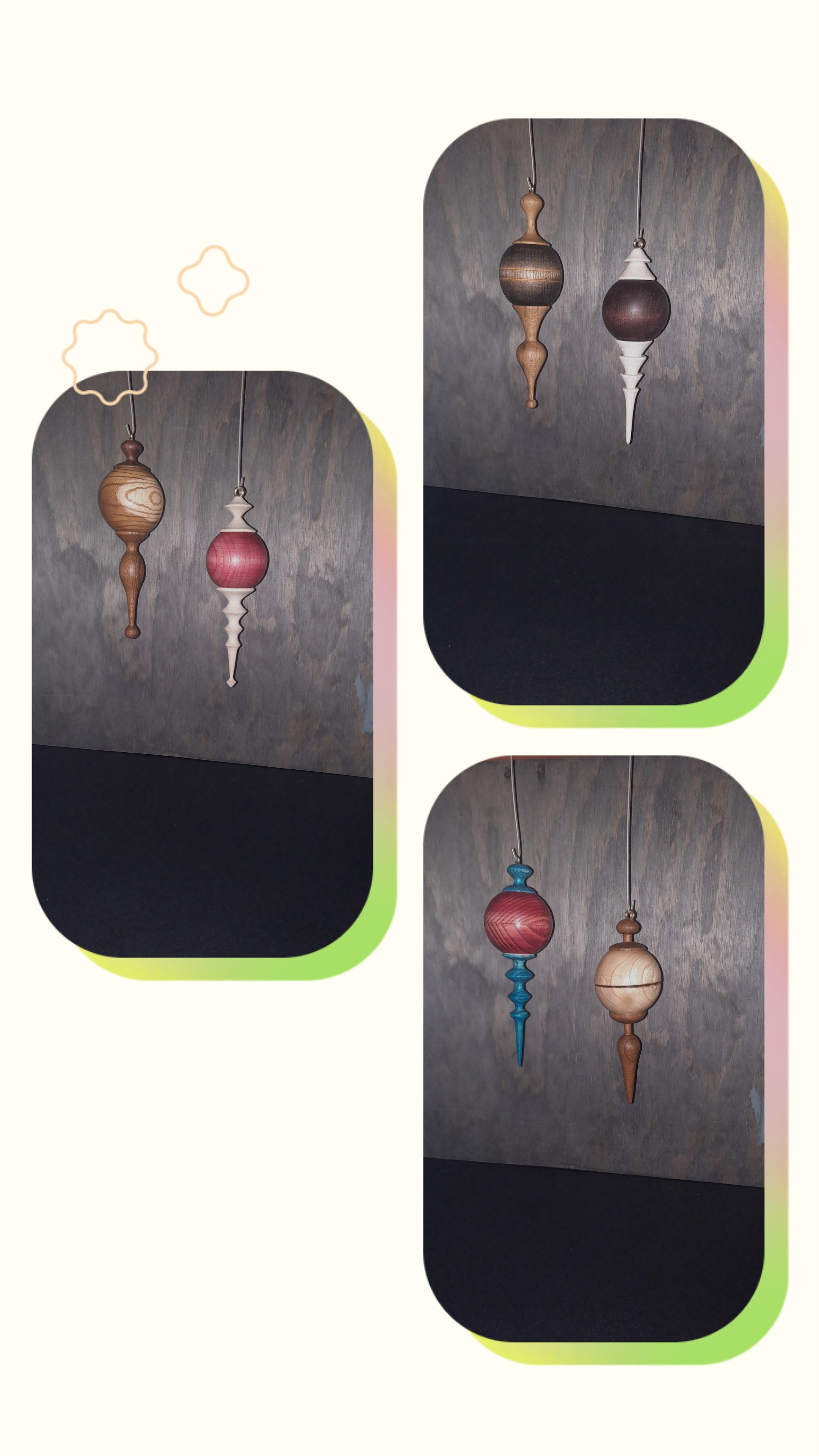 inspireret af amerikanske drejere. de kan hænge til pynt, og på juletræet. selve kuglen ca ø 50 mm, men kun mellem 1 til 2 mm tyk ,så de er meget lette, har lavet dem i mange farver og træsorter