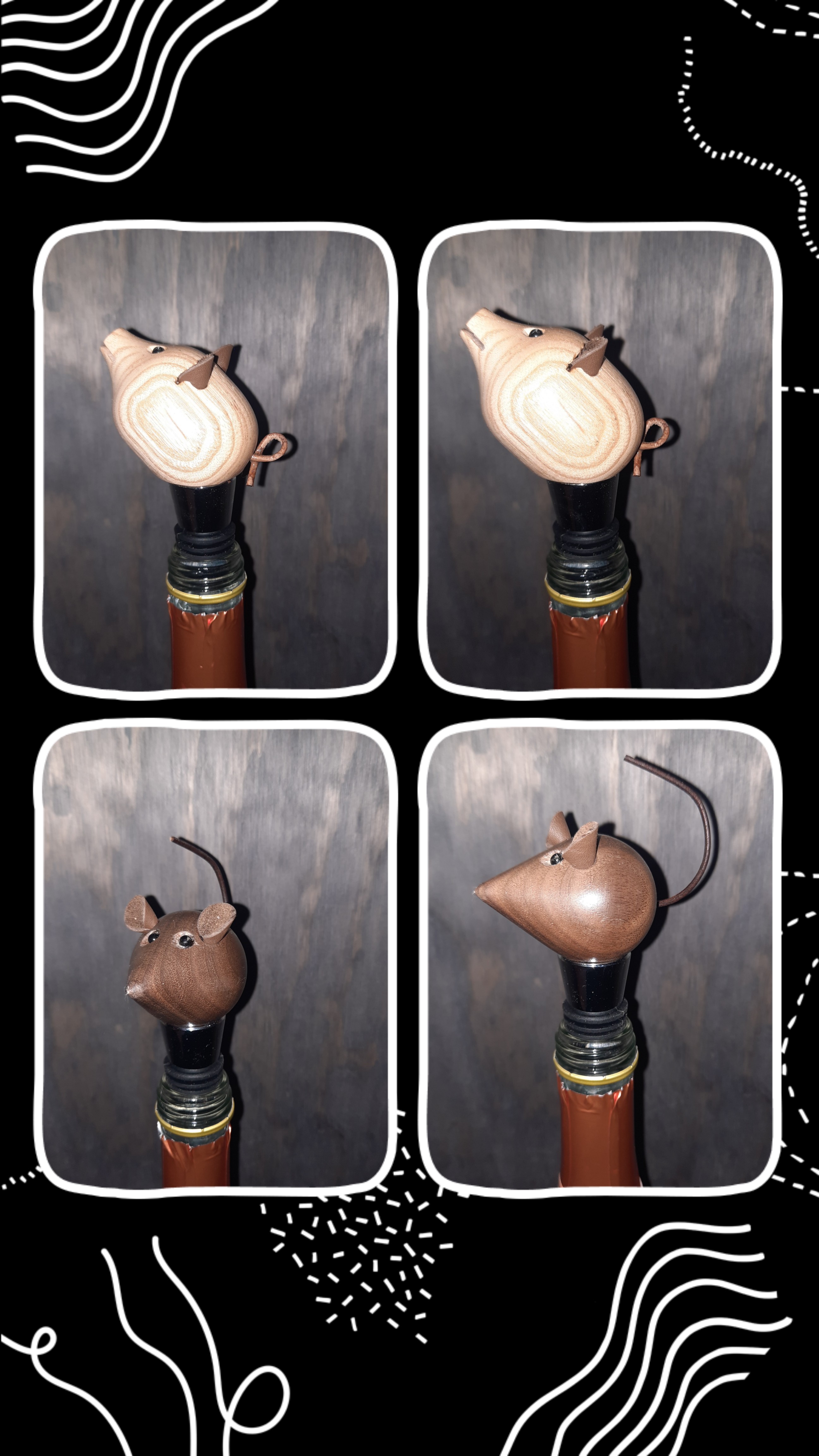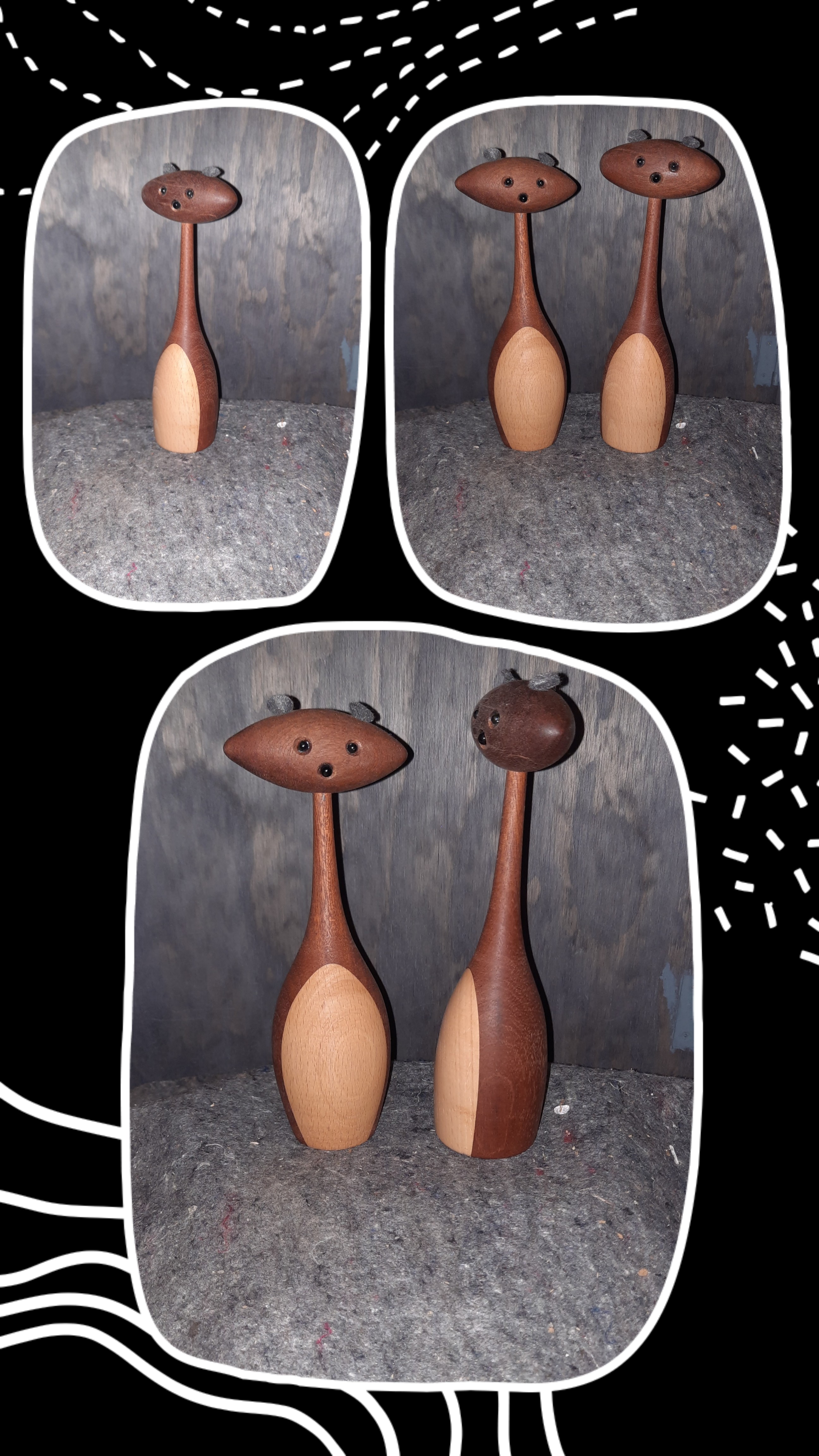 her er 2 vinpropper grisen er i ask, musen i mahogni. ører og haler i skind/læder. måske senere i andre træsorter og andre figurer