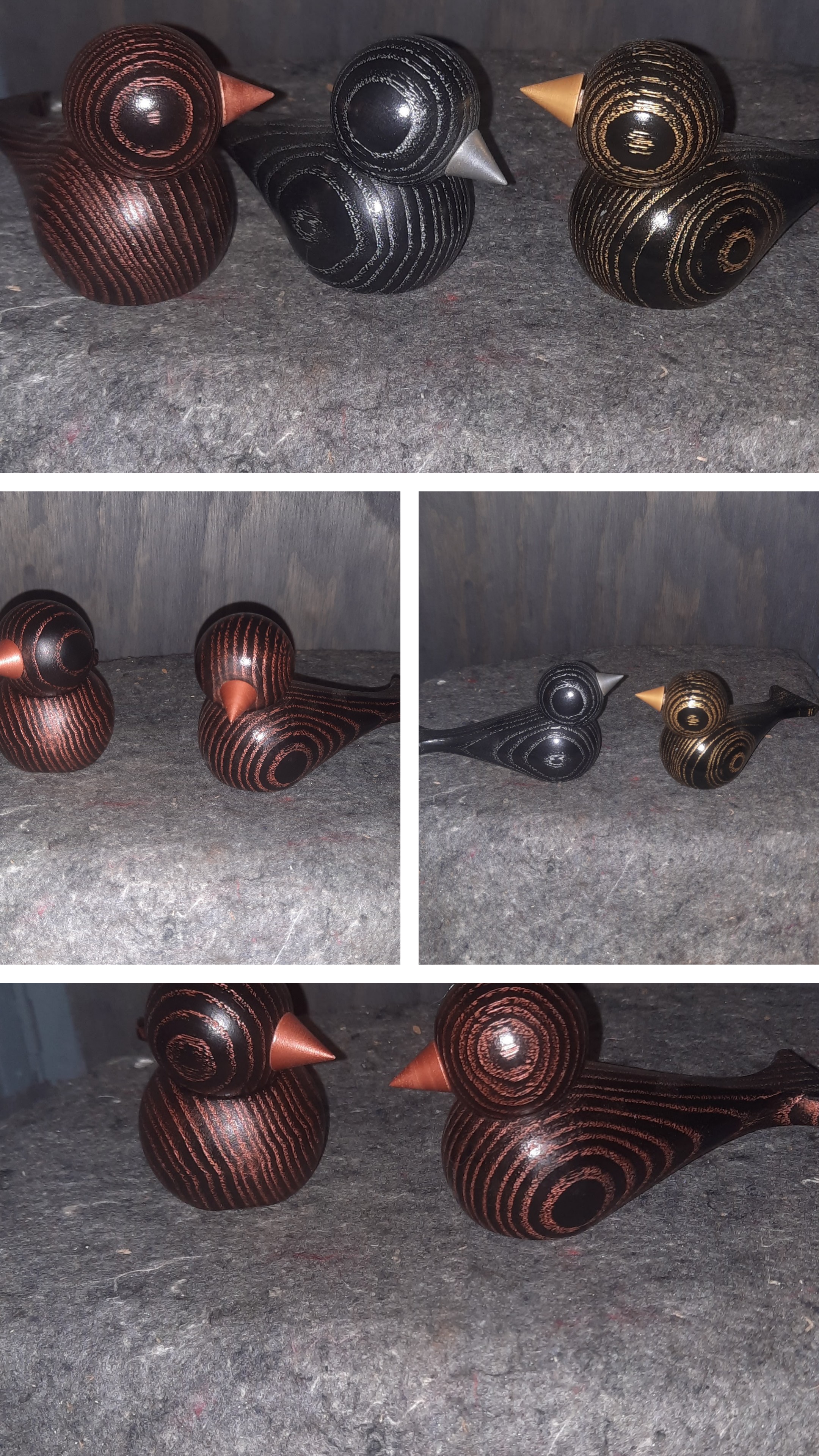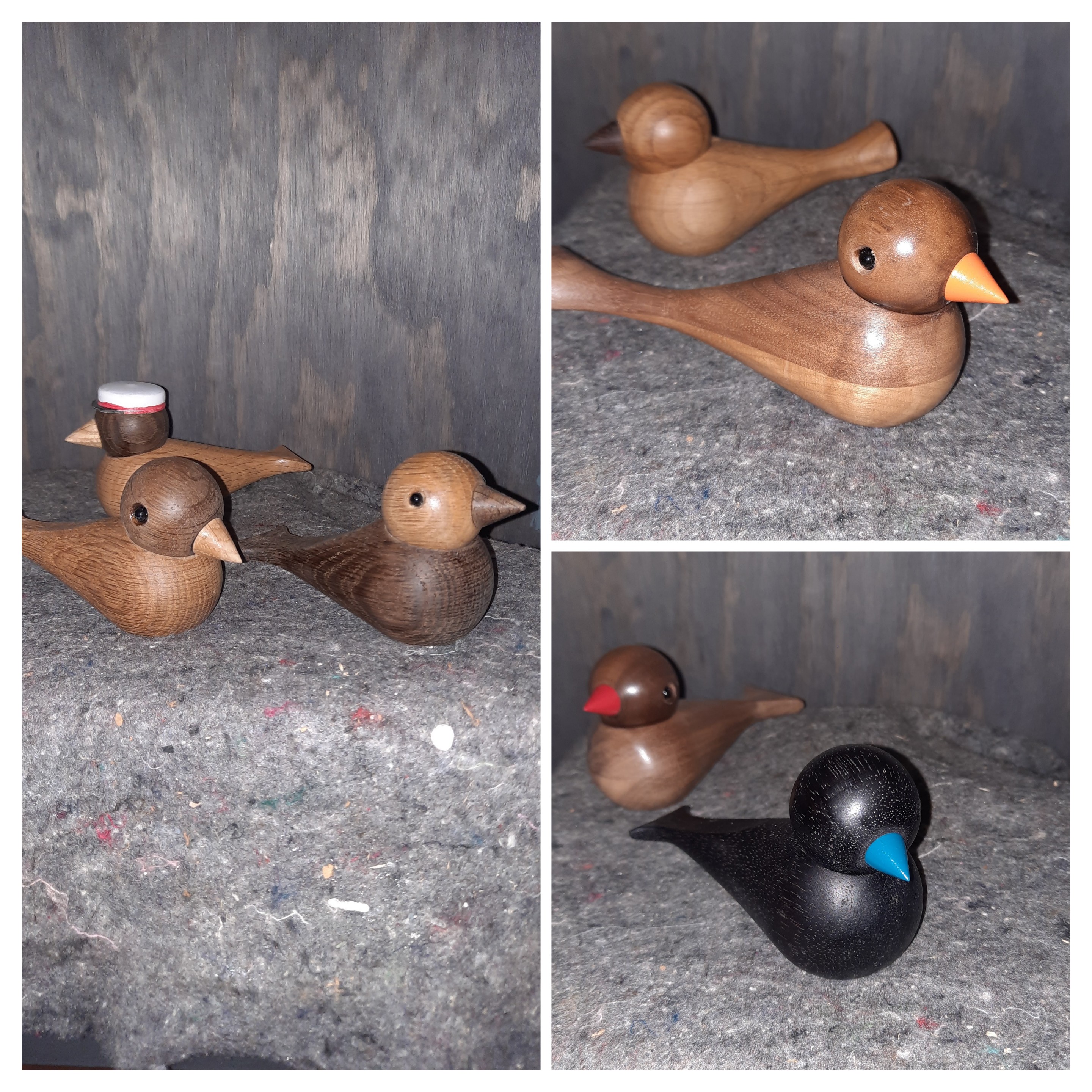 små spurve, drejet i forskellige træsorter, og med forskellige udtryk. nogle er farvede. hovedet er løst og kan stilles forskelligt for at ændre udtryk. kom og se varianter. de er ca 11 cm lange og 7 cm høje