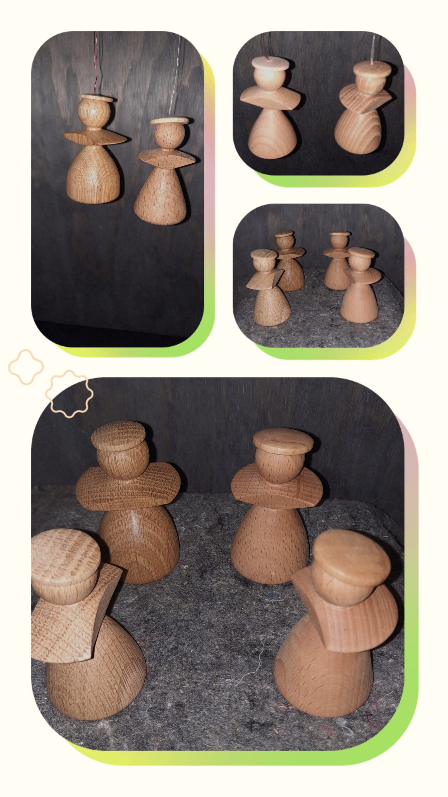 Små engle, er drejet i forskellig træ, bøg ask eller eg, 2 udformninger, stående eller hængende. de er ca 7 cm høje