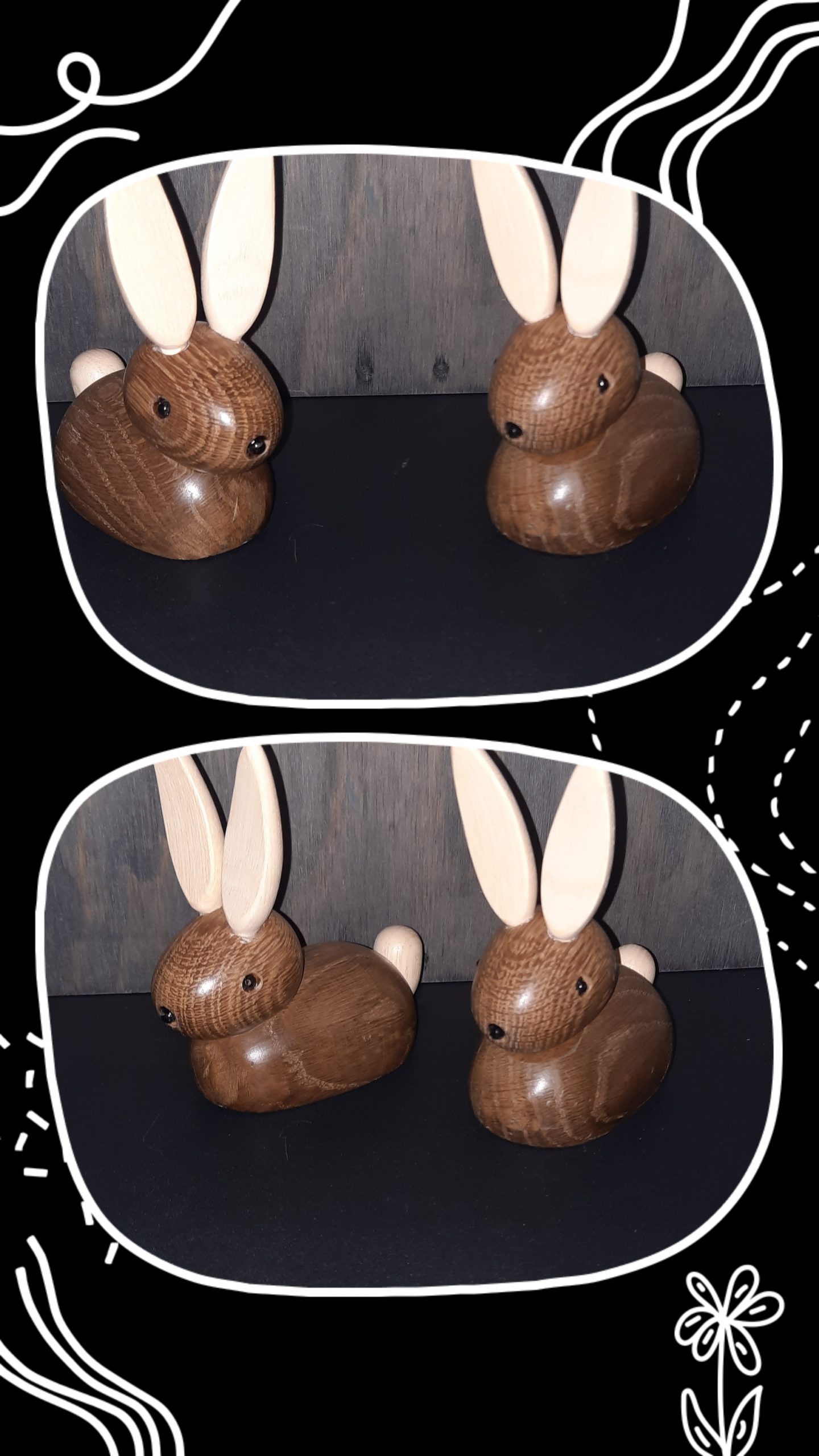 kaniner, de er i røget eg, med ører og hale i ahorn/lys ask. jeg laver dem med lidt forskellige ørestilling.de er ca 10 cm lange.