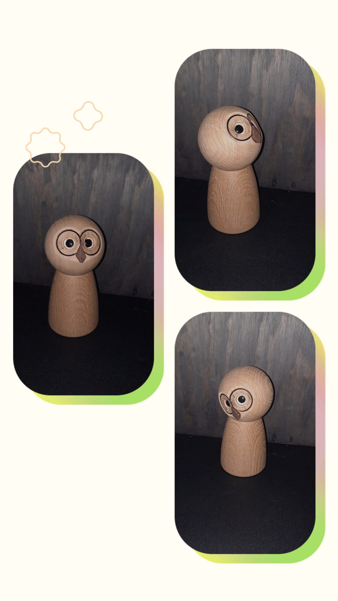 ugler med løst hoved, så du bestemmer selv hvor den skal se hen.uglerne er i lys egetræ og ca 15 cm høje. kan også laves i røget eg (mørk)